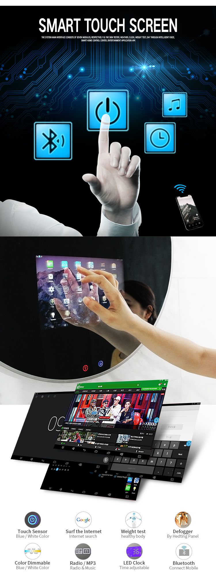 Round Shape Bathroom Touch Screen Smart Led Mirror Bathroom Vanity Mirror With Wifi
