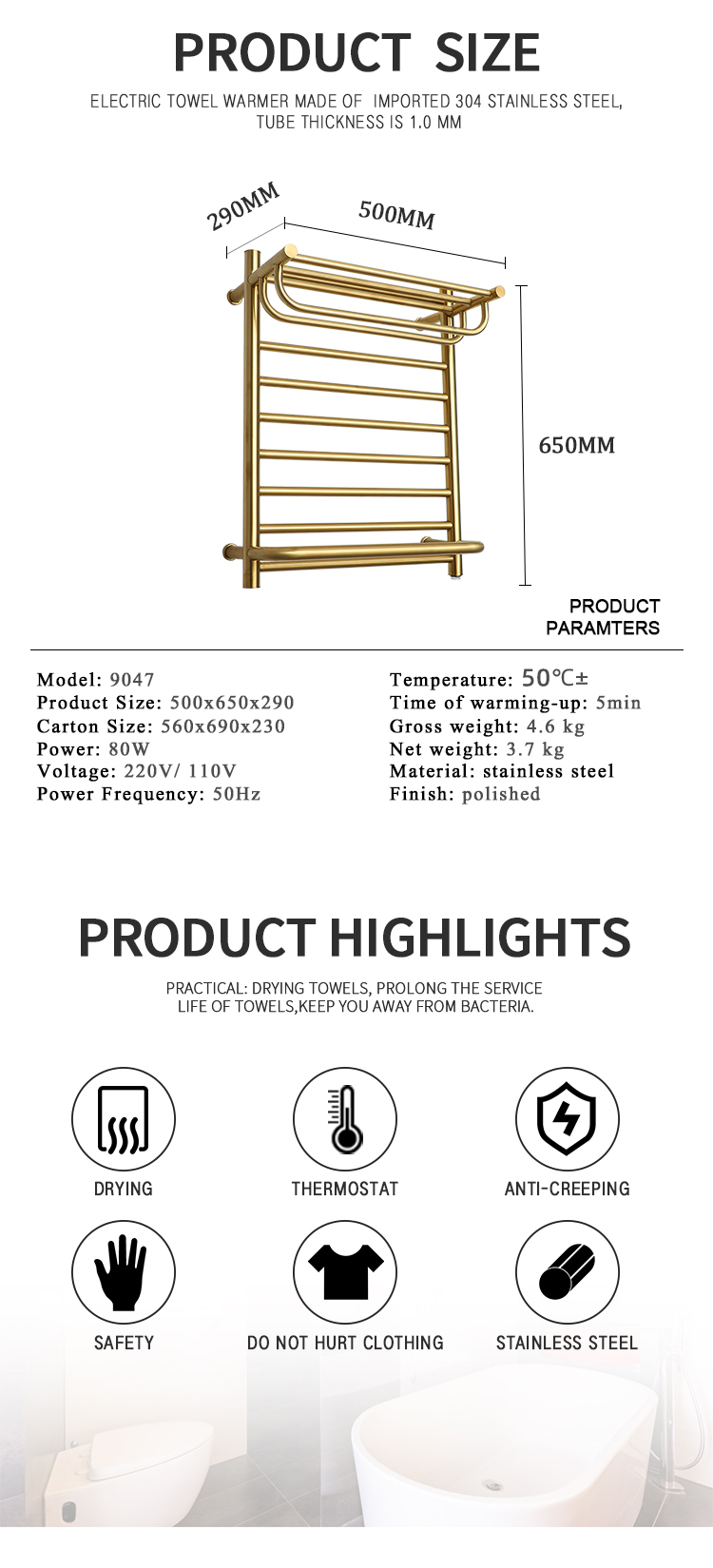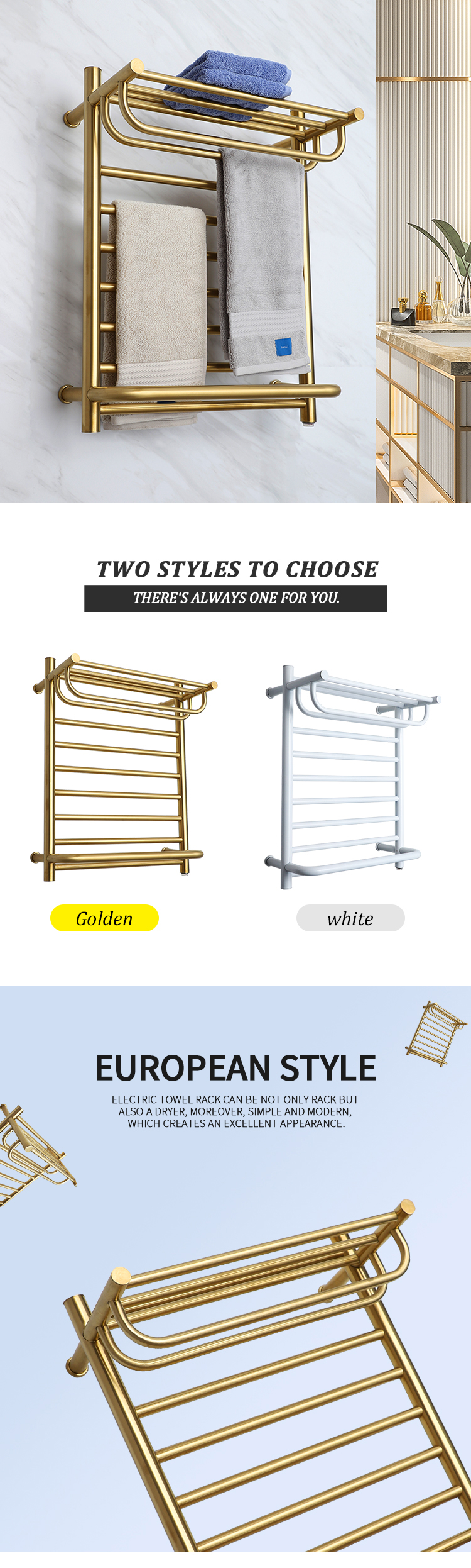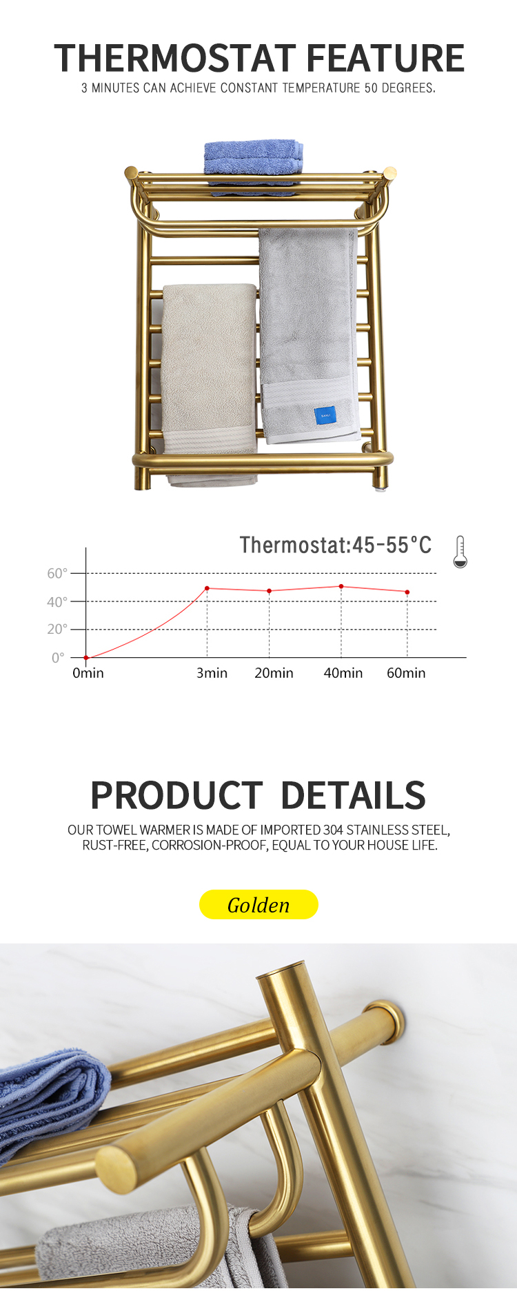 Factory Price SAA Certification Golden Heated Towel Rail Rack Towel Warmer